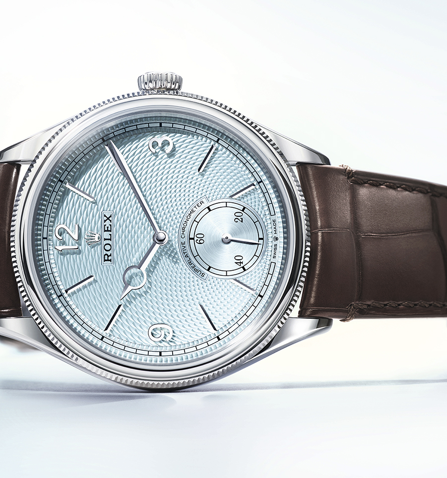 El Perpetual 1908, reloj lanzado en 2023, se viste ahora de platino 950 y luce una esfera azul glaciar, color reservado para los relojes Rolex fabricados en este prestigioso metal.