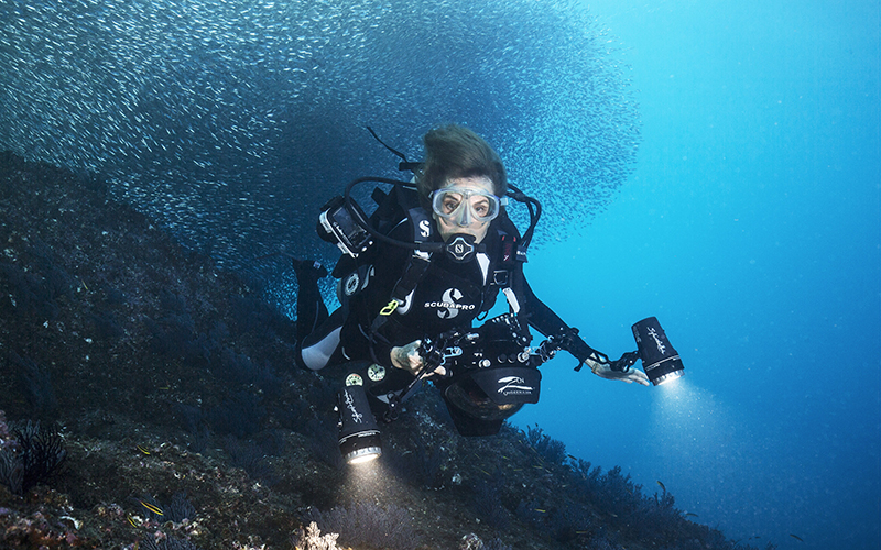La Testimonial de Rolex Sylvia Earle buceando en Cabo Pulmo, México, en 2017. La longevidad de la carrera de Earle significa que, a pesar de todas las maravillas que ha descubierto bajo el mar, también ha sido testigo del impacto devastador de la contaminación, la sobrepesca y la pérdida de los otrora vibrantes arrecifes de coral. © Rolex/Kip Evans