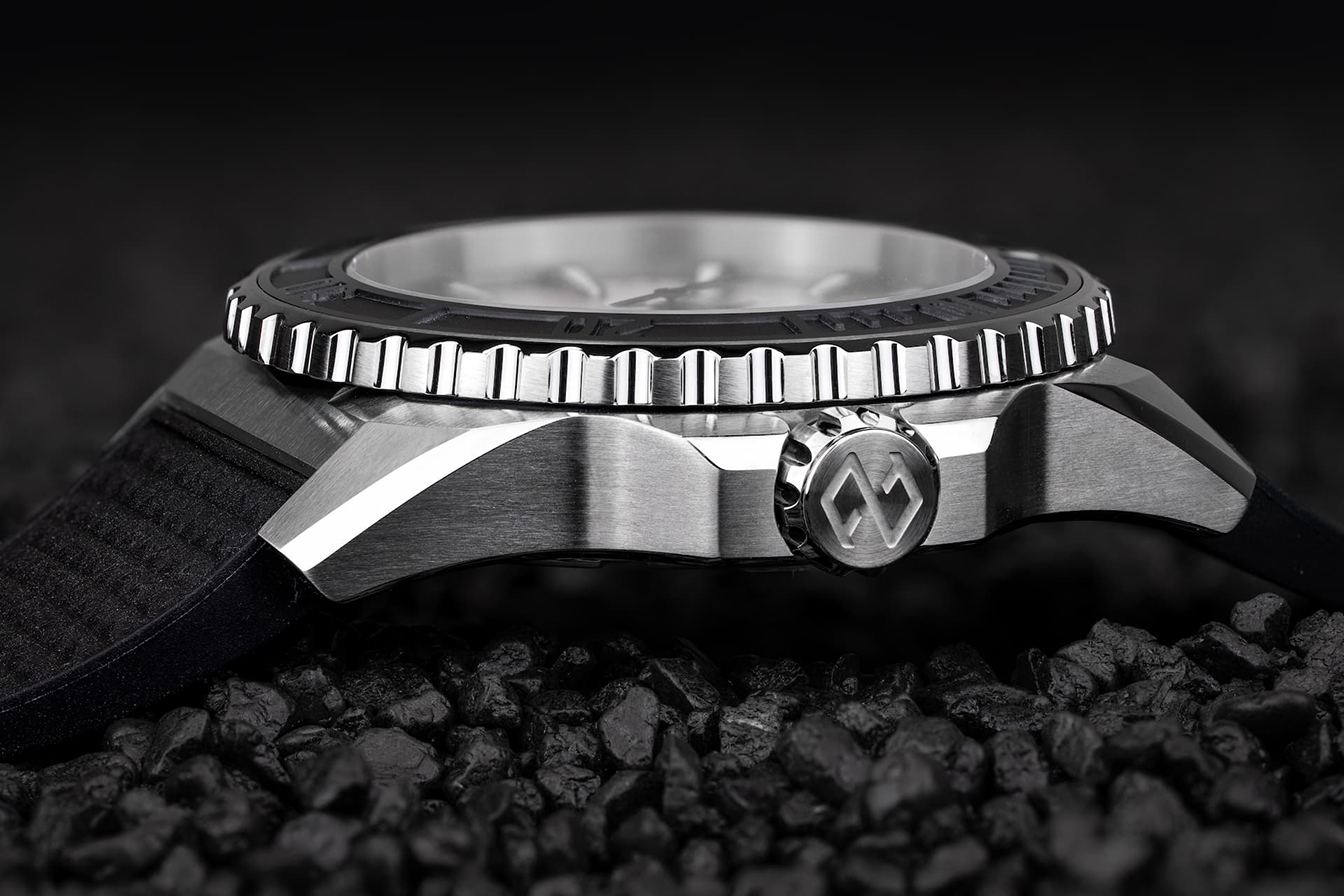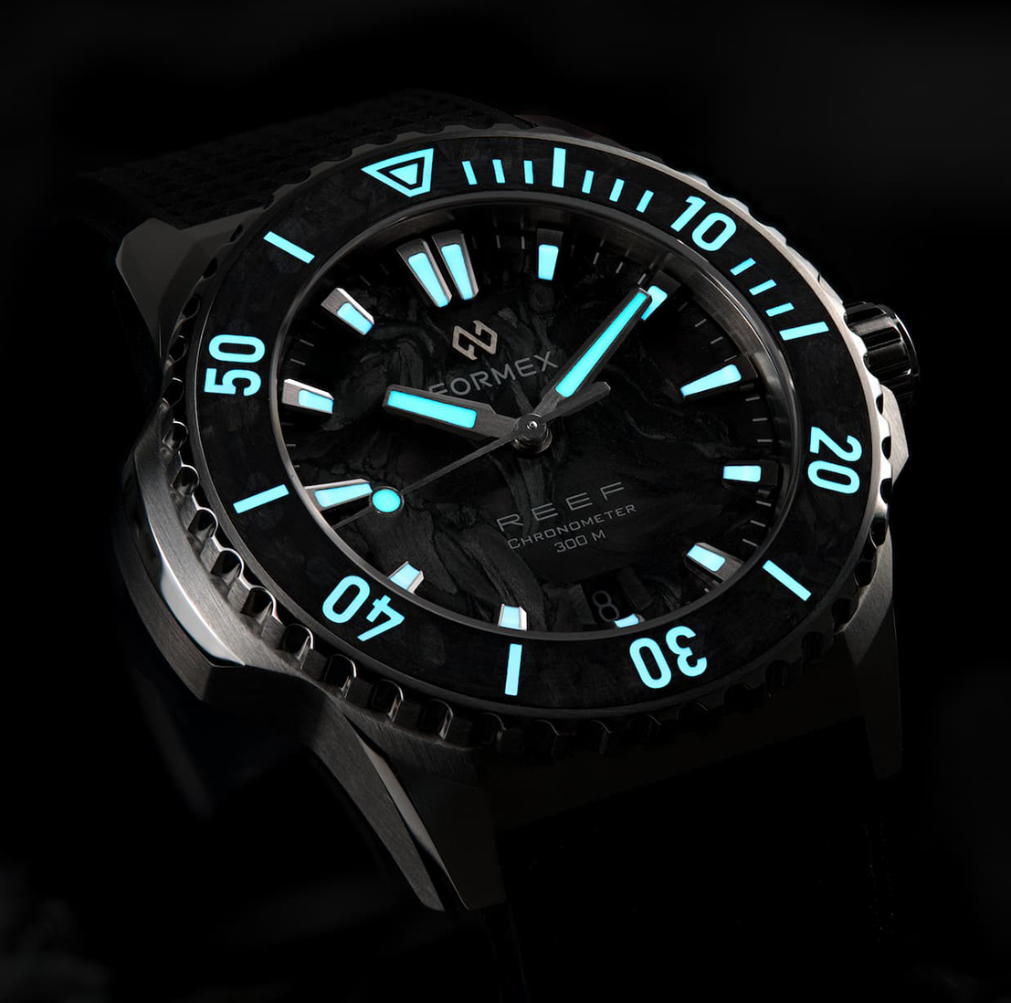 Profundidad de percepción: la estética se basa igualmente en un verdadero trabajo de ingeniería. Integrar el carbono forjado en el Reef implica adaptar el reloj al material y no a la inversa. La esfera se construye sobre una base en latón, necesaria para la estabilidad estructural así como para la fijación de las patas del cuadrante. Para garantizar una uniformidad visual, esta base recibe un tratamiento galvánico negro, evitando toda interferencia con la profundidad del carbono. Conservar la ventanilla de fecha biselada a las 6 horas –sello de Formex y uno de los elementos distintivos del Reef– requiere un control preciso del grosor y de las capas, para asegurar una geometría limpia y homogénea. Sobre el bisel, el procedimiento es también exigente. Las cifras son grabadas mediante un láser de femtosegundo que remueve el material sin generar calor susceptible de dañar o de alterar el compuesto: el carbono no se talla sino que literalmente se vaporiza. A continuación, las cavidades grabadas se rellenan a mano con Super-LumiNova BGW9 Grade A, que se aplica con un microscopio con la ayuda de una jeringa neumática, y posteriormente se polimeriza para garantizar una fijación duradera.