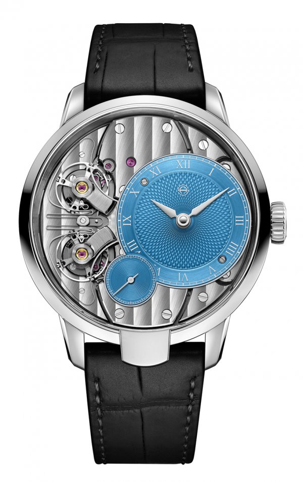 Adornado con un realce azul sobre una esfera blanca y avivado por una pequeña aguja segundera roja, esta pieza automática hecha en Francia revela modestamente su herencia, manteniendo su estilo de los años setenta.