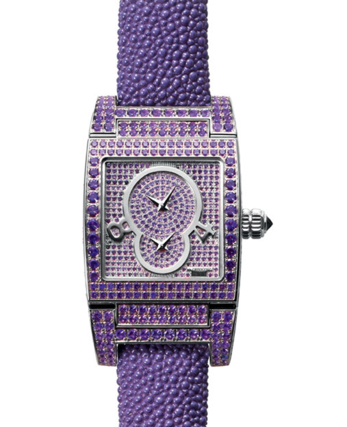 La zarina rusa tenía su famosa Cámara de ámbar en el palacio de Tsárskoye Seló: a continuación llegaron las cámaras de amatista, de zafiro rosa y hasta de zafiro naranja. Las piedras crean una suavidad de terciopelo que realza, mediante la destreza del engaste y la textura de las pulseras haciendo juego, los volúmenes de un reloj abierto al mundo con sus dos indicaciones de la hora. Hasta las horas se han vestido de colores tras pasar por los talleres de la manufactura de Grisogono.