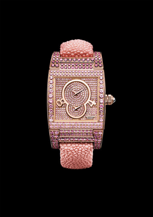 El Instrumentino de De Grisogono, abraza las muñecas femeninas con brazaletes de galuchat color rosa, naranja o violeta y está equipado con el movimiento DF-26- 91 automático con 2 husos horarios y reserva de marcha de 39 horas. Las cajas al igual que las esferas están engastadas con zafiros rosas, zafiros naranjas o amatistas.