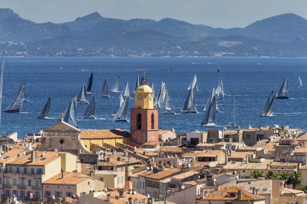 La flota reunida en el lujoso puerto de Saint-Tropez durante tres días de competición costera antes de embarcarse a Génova (Italia), atravesando la roca de Giraglia.