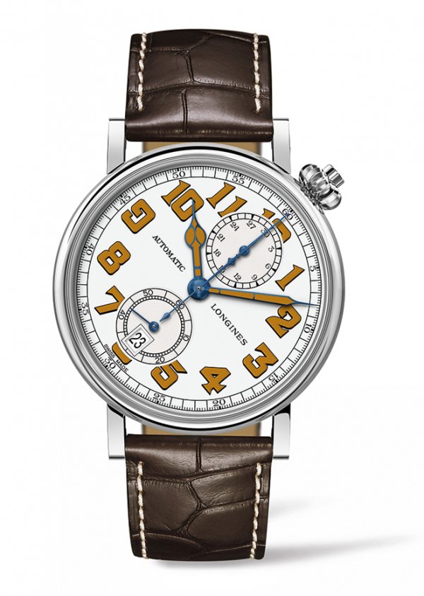 Reloj con carácter, que combina un diseño inédito con las exigencias de rendimiento y de precisión esenciales en el mundo de la aviación, The Longines Avigation Watch Type A-7 1935 llamará la atención. Su caja de acero inoxidable, de 41 mm de diámetro, aloja el calibre automático L788.2, movimiento de rueda de pilares desarrollado en exclusiva para Longines, que permite el control de las distintas funciones del cronógrafo: arranque, parada, puesta a cero, presionando simplemente el monopulsador integrado en la corona acanalada. Las elegantes agujas de tipo «pera esqueleto» de acero azulado y barniz de tono miel, complementan la destacada estética de este modelo, presentado con una correa de piel de caimán de color marrón, que realza el conjunto.