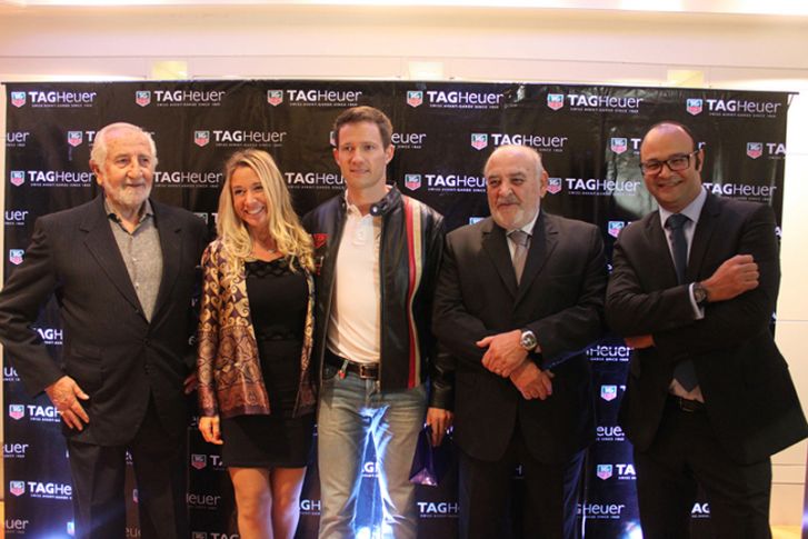 Rogelio Abella, Valeria Yavícoli y Aquiles Yavícoli de Darssa (distribuidora de TAG Heuer en la Argentina) junto al campeón Sébastien Ogier y Bruno Duchêne (Regional Sales Manager de TAG Heuer) en la Joyería Jean Pierre en Buenos Aires.