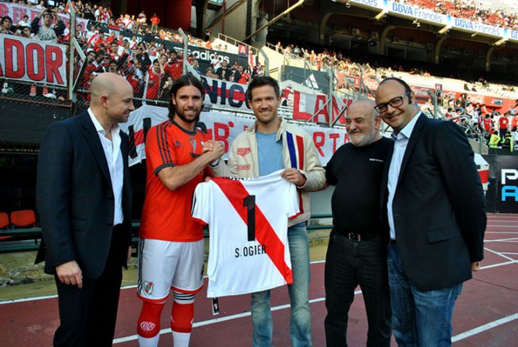 Adrián Varela (dirigente de River Plate), Fernando Cavenaghi (jugador de River Plate), Sébastien Ogier, Aquiles Yavícoli y Bruno Duchêne en el estadio Monumental de River Plate.