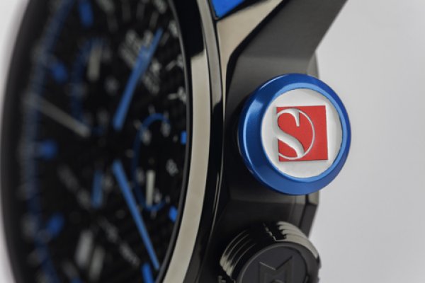 La sensación de «pit lane» está realzada con un fondo de caja numerado con una especial «tyre imprint», grandes pulsadores de cronógrafo de start y stop, múltiples funciones de cronógrafo, escala de taquímetro con medición de velocidad y una atractiva correa azul de caucho.