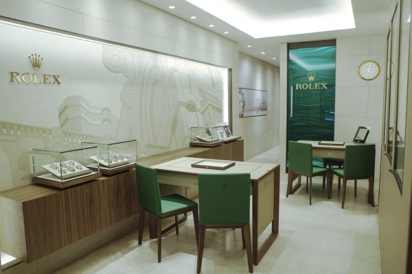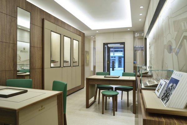 Al entrar en la Boutique Rolex, el visitante se sumerge de inmediato en la atmósfera de la marca. Frente a la entrada, la emblemática pared «Aqua» está retroiluminada para resaltar el relieve del motivo de olas verdes. La piedra beige de las paredes confiere claridad y luminosidad al lugar. Una de ellas, especialmente elaborada, presenta un estuco de gran tamaño que reproduce la «Casa Barolo», un conocido edificio de Buenos Aires. El espacio de exhibición y el de asesoramiento permiten al cliente vivir una verdadera experiencia de lujo. Se puede apreciar una amplia gama de modelos Clásicos y Profesionales de la colección Oyster, verdaderos emblemas de la marca, que unen estilo, última tecnología, tradición y precisión.