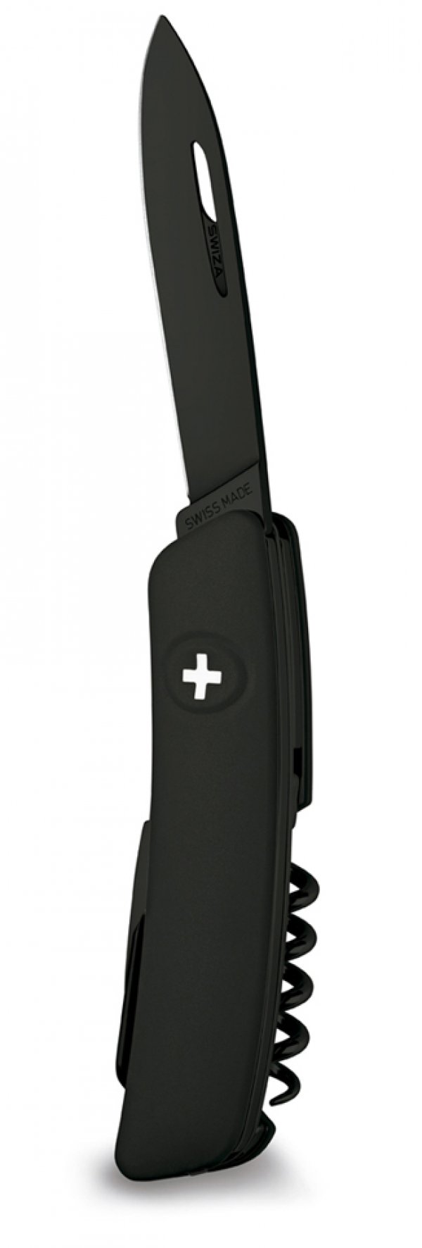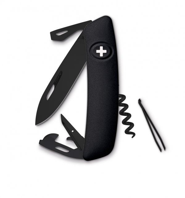 La navaja Swiza D01 Allblack tiene un sacacorchos tipo sommelier con 5 giros, un punzón y lezna con enhebrador de agujas integrado y una pinza con puntas diagonales para un trabajo preciso. Por su parte, la navaja Swiza D03 Allblack incluye un abridor de botellas con destornillador de cabeza plana Nº 3 con pelador de cables y un abridor de latas con un destornillador de cabeza plana Nº1. Si se ensucia, la navaja puede ser lavada en un lavaplatos a una temperatura de hasta 80º C. Luego de lavarla, se debe aplicar una gota de aceite a todas las partes móviles.