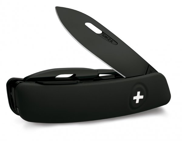 Este nuevo desarrollo desde Delémont se encuentra entre los más altos niveles de calidad. Al igual que con todos los modelos de navaja Swiza, la hoja extra sólida de 75 milímetros de largo (con cobertura PVD) está hecha de acero 440 libre de óxido high-end endurecido a 57 HRc en la escala Rockwell y equipada con un sistema de bloqueo de seguridad. Este sistema evita los cierres bruscos durante el uso. La hoja puede ser plegada fácilmente y con seguridad presionando sobre la cruz blanca del logo de Swiza. Su mango de forma ergonómica posibilita la abertura y cierre de las herramientas fácilmente y con seguridad y permite un seguro agarre incluso con las manos húmedas, gracias a su suave superficie antideslizante.