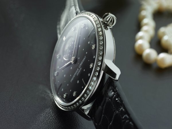 Como es costumbre en Frédérique Constant, la marca introduce una novedad que combina a la perfección elegancia y técnica relojera, proponiendo un reloj con una complicación de fase lunar y que presenta unos complejos acabados y un bisel engastado con diamantes. Está disponible con caja de 38,8 mm de acero enchapado en oro rosa y 60 diamantes (0,5 quilates) engastados alrededor del bisel.