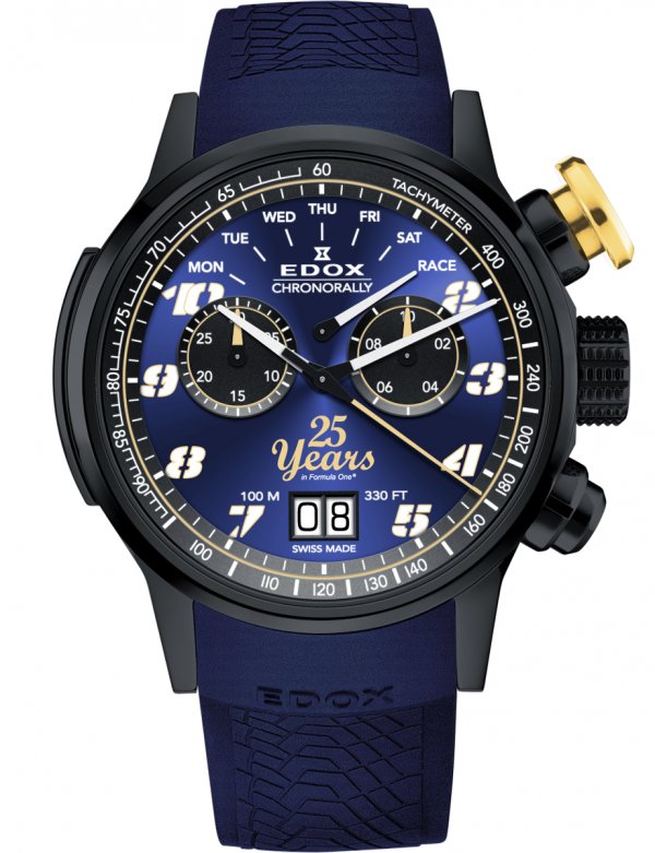 El Edox Chronorally Sauber F1® Team 25th Anniversary Limited Edition tiene en la esfera un logo especial por los 25 años en la categoría (es el cuarto equipo con mayor antigüedad compitiendo en la F1) en donde el éxito demanda perfección en cada giro, el mismo carácter distintivo que Edox aplica en su misión por producir la mejor relación calidad-precio en el mercado de la relojería.
