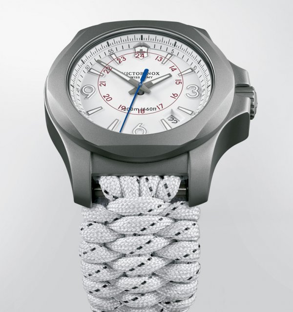 La inspiración espacial del I.N.O.X. Sky High se refleja de forma sensacional en la innovadora correa de paracord Naimakka, de color blanco con motas negras y con fibras Technora® en su interior. Este tipo de fibra de para-aramida, con una dureza ocho veces superior a la del acero, desempeñó un papel clave en el aterrizaje del robot Curiosity en Marte. La cuerda de paracaídas (paracord) también se ha utilizado para reparar el telescopio espacial Hubble. La combinación del blanco y el gris mate del titanio arenado, un material superresistente, recuerda a los trajes espaciales. Varios detalles también inspirados en la aeronáutica acentúan el diseño basado en la funcionalidad de este modelo: la hora militar impresa en rojo bajo el cristal, tres grandes números en la esfera y el segundero azul, como el planeta Tierra.