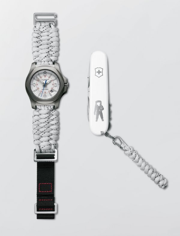 Los 2.000 ejemplares de la edición limitada I.N.O.X. Titanium Sky High se entregan en su propia caja-cápsula del tiempo, un envase a prueba de golpes y resistente al agua: un verdadero tesoro para la supervivencia. Contiene una correa blanca de caucho con dos trabillas, una en azul y otra en rojo. El plan B ideal si queremos remplazar la correa paracord para fabricar un paracaídas supersónico o simplemente para cambiar de estilo. También se incluye una edición especial en blanco de la navaja Swiss Army, con una incrustación metálica que representa a un astronauta y un llavero paracord. Se trata de una réplica de la navaja roja que solían llevar los astronautas y que se expone en el museo de Victorinox.