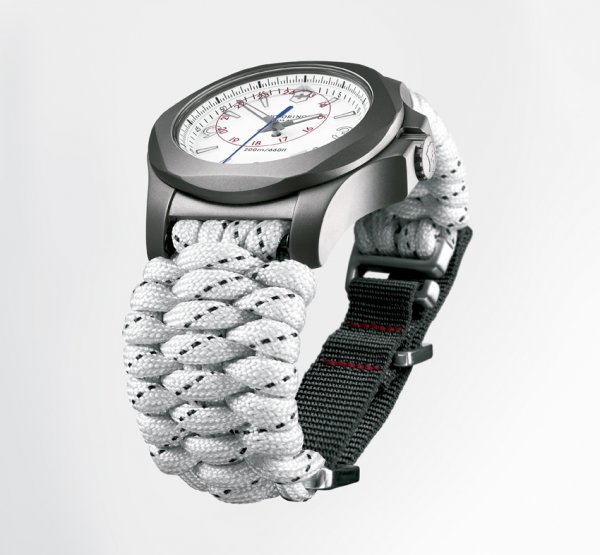 Agujas, números e índices con tratamiento Super-LumiNova®. Hora militar impresa en rojo bajo el cristal. Ventanilla de fecha a las 4:30. Correa paracord blanca con motas negras y fibras interiores Technora®. Correa de repuesto blanca de caucho auténtico. Movimiento de cuarzo de fabricación suiza Ronda 715.