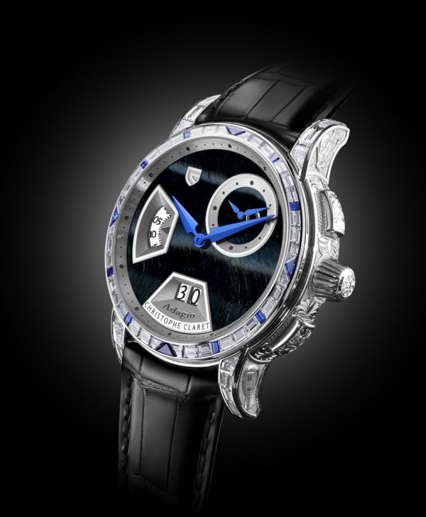 El reloj Adagio está disponible en distintas variaciones únicas, en oro rojo 5N, oro blanco o platino. La caja puede estar grabada por completo, engastada con diamantes de talla baguette en el bisel o con diamantes de talla baguette y zafiros.