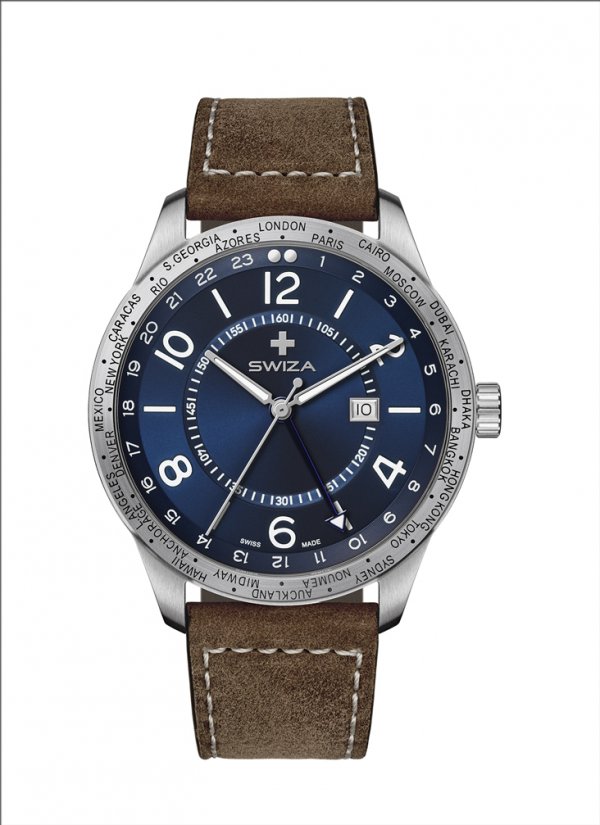Para cruzar las fronteras, el Swiza Magnus GMT deleita con su huso horario adicional y el nombre de múltiples ciudades para el segundo huso horario grabado en la caja. Un índice de 24 horas es agregado en la esfera azul, negra o blanca y la correa de cuero de nubuck es duradera para los viajeros. Distinguido en cualquier ciudad y osado por su diseño, puede ser usado en cualquier circunstancia.