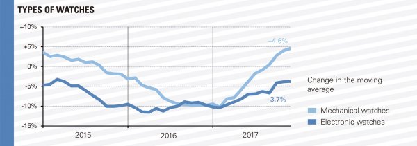 a situación de las exportaciones relojeras suizas fue mejorando regularmente en el transcurso del año 2017. Su valor no sobrepasó finalmente la barrera de los 20.000 millones de francos suizos. Han registrado un resultado de 19,9 mil millones, es decir un alza del 2,7% en relación a 2016. El primer semestre (+0,3%) ha permitido estabilizar la tendencia, mientras que el segundo ha sido testigo de un marcado crecimiento (+4,9%).