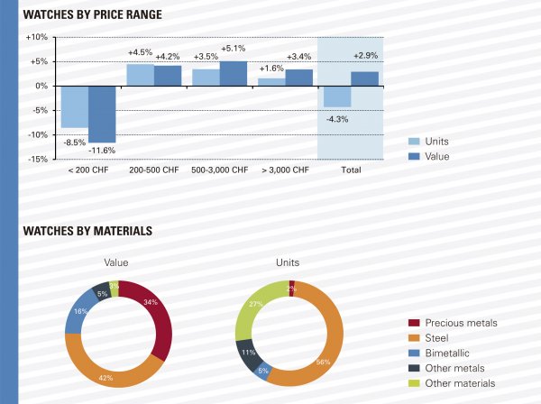 El valor de las exportaciones de relojes pulsera alcanzó los 18,8 mil millones de francos suizos, lo que corresponde a un crecimiento del 2,9% en relación a 2016. Por su parte, el número de piezas continuó disminuyendo: se exportaron 1,1 millón de unidades menos (-4,3%), con un total de 24,3 millones de piezas. Se trata del nivel más bajo desde la crisis de 2009. El retroceso en volumen ha estado influenciado por los relojes de cuarzo, que registraron una baja de 7,4%. Por otro lado, los relojes mecánicos crecieron tanto en valor (+4,6%), como en número de piezas (+3,9%). Entre los principales segmentos de precio, los relojes de menos de 200 francos suizos (precio de exportación) han visto su nivel caer un 8,5% en volumen y 11,6% en valor, mientras que las otras gamas lograron un crecimiento de entre un 3% y un 5% en términos de valor.