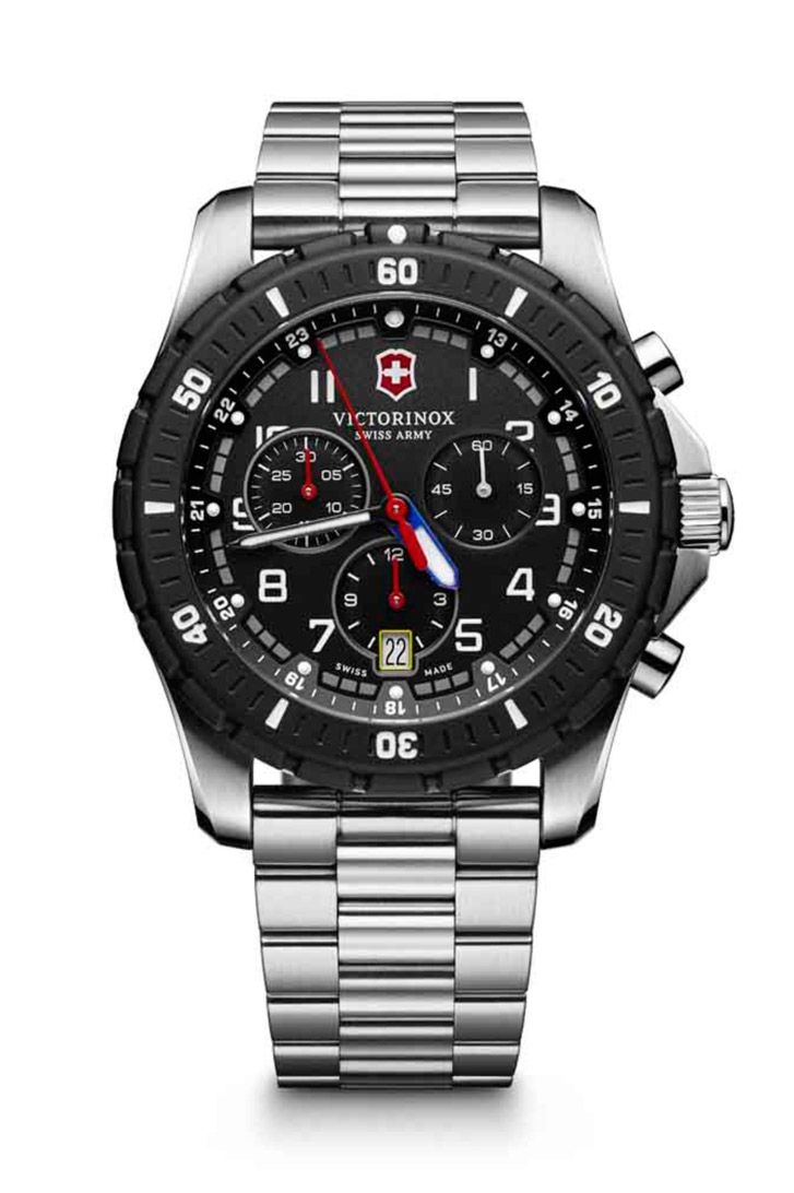Común a todos los modelos, su caja de 43 milímetros de diámetro y de acero pulido y cepillado en los ángulos hace gala de su robustez, una cualidad que se ve reforzada por la fuerte presencia del protector de la corona. Las esferas, de color plateado o negro, se ven rodeadas por un bisel giratorio unidireccional negro con números impresos de gran tamaño, facilitando así la lectura de la hora. Todos los detalles de la esfera llevan la firma de la casa: la aguja de las horas, de color azul, está recubierta de material luminiscente, al igual que la de los minutos. Ambas se sitúan bajo la trotadora de color rojo, que se hace eco del escudo de Victorinox, situado a las 12 h. A fin de facilitar la lectura de su función, la misma tonalidad decora igualmente las agujas de los dos contadores del cronógrafo.
