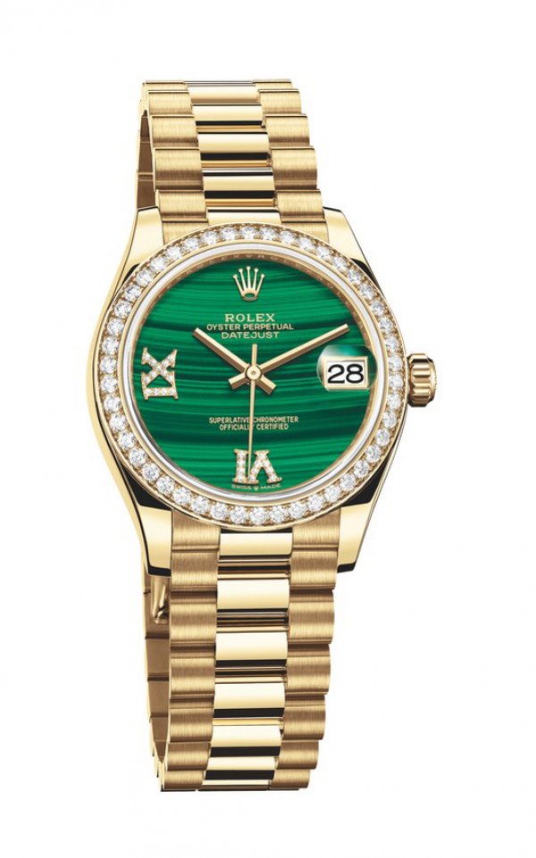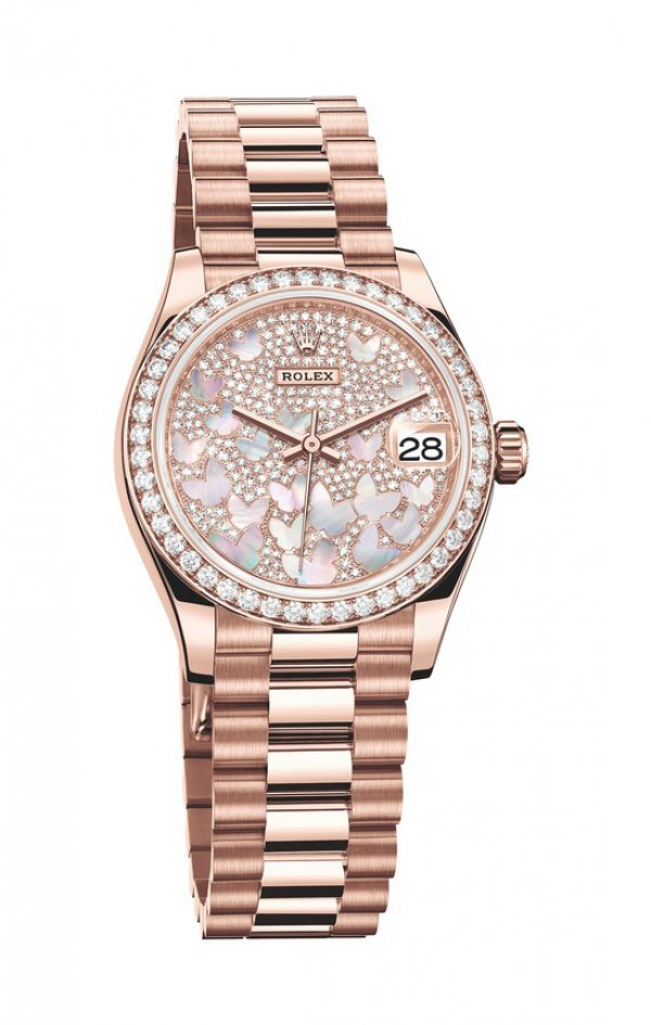 R olex desvela la nueva generación de su modelo Oyster Perpetual Datejust 31 con una caja de 31 mm de diámetro, con las asas y los flancos de la carrura rediseñados. Todas las nuevas versiones están disponibles en oro blanco, amarillo o Everose de 18 quilates. Entre las numerosas versiones disponibles, una de ellas, en oro blanco de 18 quilates, combina una esfera de nácar blanco con un bisel engastado de diamantes. Una segunda, en oro amarillo de 18 quilates, está dotada de una esfera de malaquita con números romanos VI y IX en oro amarillo de 18 quilates engastados de diamantes. Una última versión, en oro Everose de 18 quilates, presenta una esfera en pavé de diamantes y adornada con una marquetería de mariposas en nácar rosa.