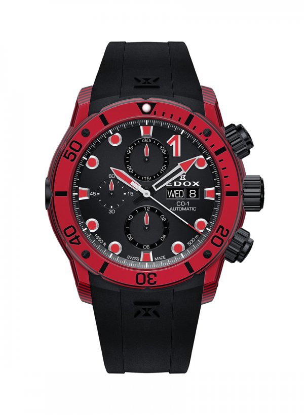 Disponible en cuatro variantes de colores: Negro/Azul; Negro/Rojo; Negro/oro Rosa o Negro sobre Negro, todos presentan la parte posterior de la caja transparente que permite una vista completa del movimiento. El Edox Automatic Chronograph Carbon es otro súper ejemplo de precisión de los relojes Edox.