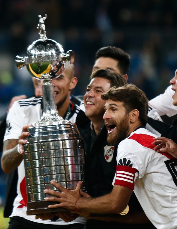 El entrenador de River Plate Marcelo Gallardo y el capitán Leonardo Ponzio, junto al equipo campeón acariciando la Copa obtenida.