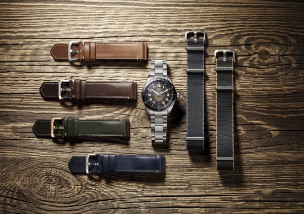 Las correas de piel de becerro son de color marrón oscuro o marrón claro. Los modeloscon brazalete de acero inoxidable se presentan en un estuche que también incluye una correa NATO. El brazalete y la correa pueden intercambiarse con facilidad mediante los pulsadores situados en la parte inferior de la caja, por lo que no se necesitan herramientas. Las correas NATO, las correas de cuero y los brazaletes de acero inoxidable se venden por separado.