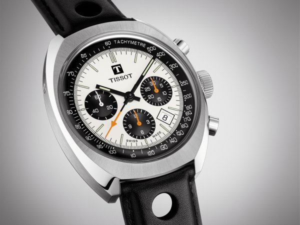 El Tissot 1973, fiel al espíritu de los relojes de competición de la década de 1970, es un cronógrafo con forma de cojín oval con líneas combadas en sus tres dimensiones. Su cristal de tipo box está tallado en zafiro. La aguja de los segundos y la del cronógrafo se visten de color naranja; las de las horas y los minutos son agujas tipo bastón rectangular con remate blanco en la punta. La esfera plateada contrasta con los contadores y el realce tacómetro de color negro, lo que crea un efecto estilo panda. La correa de becerro negro pespunteada es una reproducción del modelo que Tissot inventó y patentó en la década de 1960, caracterizado por sus orificios grandes. Esas perforaciones recuerdan al volante de los coches de carreras de la época.