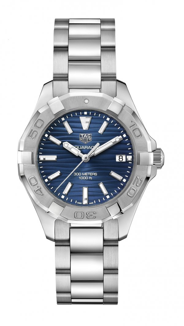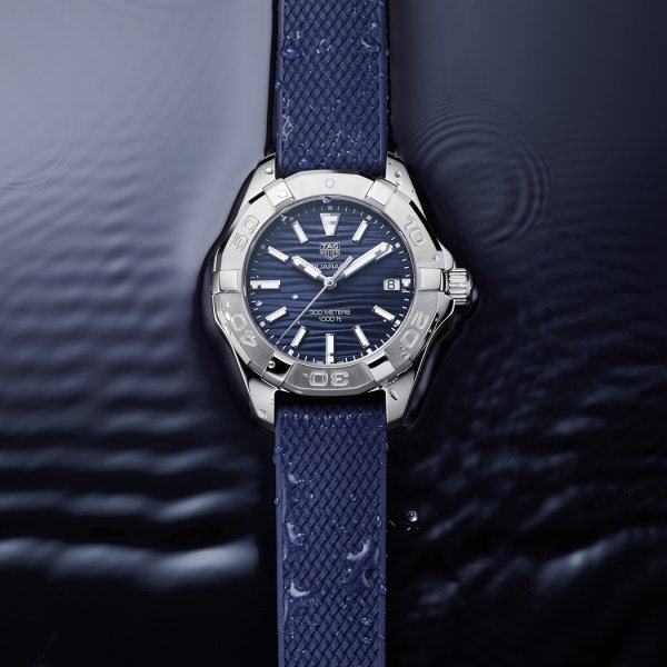El aspecto más llamativo de los nuevos modelos Aquaracer de 35 mm es el toque de azul, un tono profundo y encantador que evoca sensaciones de días pasados felices relajándose en un yate. La esfera azul tiene un efecto reflectante de rayos de sol y un patrón grabado de ondas de arena que recuerda a las suaves olas que bañan las costas arenosas de una playa tropical. Los modelos de acero inoxidable con una esfera azul se presentan con pulsera de acero inoxidable o correa de caucho en el mismo tono azul. El patrón de trama cruzada en la correa imita la textura de las cuerdas de vela, un toque que resalta su pedigrí marino. La correa de caucho es ideal para practicar deportes acuáticos porque es duradera, cómoda, ligera e impermeable. El tercer modelo de la colección tiene una elegante esfera de nácar y también se presenta con una correa de caucho azul. Los tres modelos cuentan con fechador a las 3 h en la esfera.