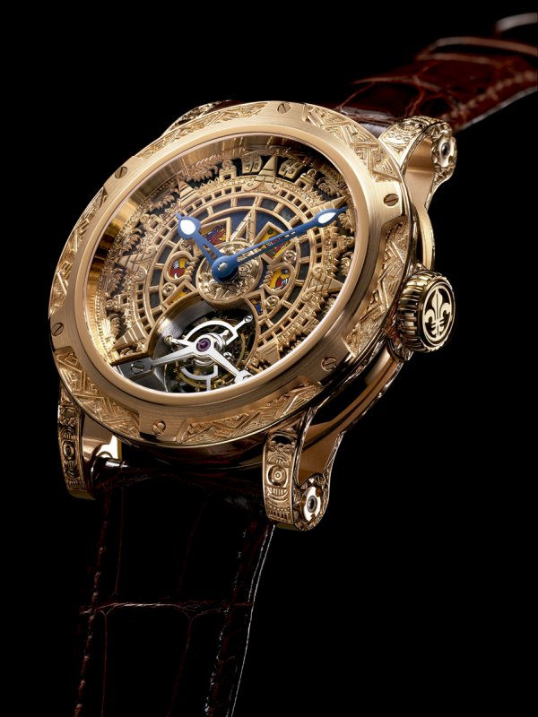 La célebre caja NEO de Louis Moinet, tallada en oro rosa 5N, acentúa la fuerza de carácter del diseño.