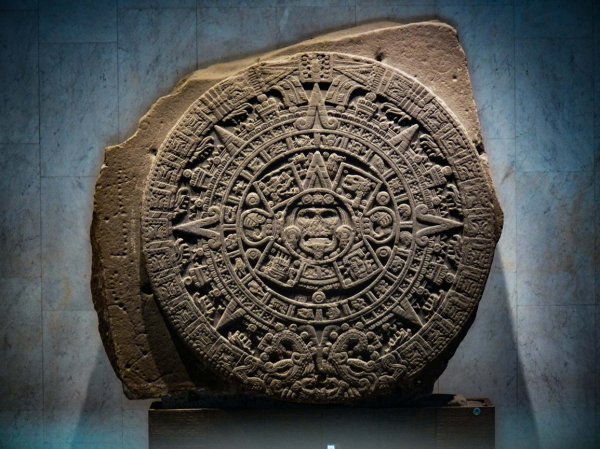 El centro de la esfera representa la Piedra del Sol, una de las producciones más célebres y significativas del arte azteca, esculpida bajo el emperador Axayácatl (1469-1481) para conmemorar la fiesta del fuego nuevo de 1479. Se trata de un disco gigante de 3,6 metros de diámetro tallado en un bloque monolítico de lava basáltica de olivino, que pesa 24 toneladas. En la actualidad, la Piedra del Sol está expuesta en el Museo Nacional de Antropología de la ciudad de México. La Piedra del Sol está formada por ocho círculos concéntricos que contienen numerosas referencias a la cosmogonía azteca y que describen la formación del mundo. En particular, el segundo círculo destaca por los símbolos de los dioses Ehécatl, Tezcatlipoca, Tláloc y Chalchiuhtlicue, y evoca la leyenda de los soles, mito cosmogónico basado en la creación y la destrucción de varios mundos sucesivos.