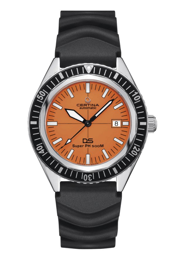 El nuevo DS Súper PH500M de edición especial, respeta el diseño, convirtiéndose en el último reloj de buceo de Certina. Cuenta con un bisel giratorio que solo puede girarse ejerciendo una leve presión y en un único sentido. Se trata de una medida de seguridad diseñada para prevenir cambios involuntarios durante el tiempo de inmersión. En su caja de 43 milímetros presenta un cristal de zafiro resistente que impide cualquier tipo de marca, al igual que su modelo de inspiración. Además, cuenta con revestimiento de material luminiscente que ofrece una visión clara. El fondo de caja y la corona, ambos enroscados, otorgan hermeticidad al reloj hasta 500 metros de profundidad. La esfera naranja también se inspira en el histórico reloj de buceo de Certina y aporta a esta nueva edición contemporánea una personalidad propia y una legibilidad óptima. El reloj está acompañado de una correa de caucho negro con un motivo decorativo de ondas y una extensión aparte para el buceo.