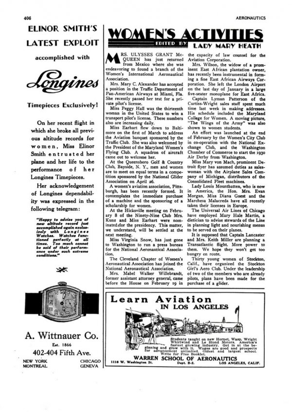 E linor Smith, 9.929 metros. Al volar a 914 metros en 1931, la aviadora estadounidense Elinor Smith perdió la consciencia. Intentaba batir un récord cuando su avión empezó a caer en picado. Smith se despertó en el último minuto y logró aterrizar con seguridad. Diez días después se elevó incluso más alto y estableció un nuevo récord a 9.929 metros, siempre confiando en su reloj Longines. Tras convertirse a los 16 años en la piloto autorizada más joven del mundo, Smith batió a lo largo de su vida varios récords en solitario de resistencia, velocidad, altitud.