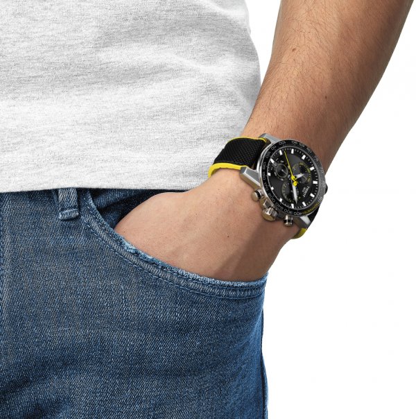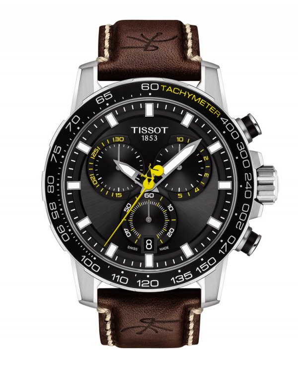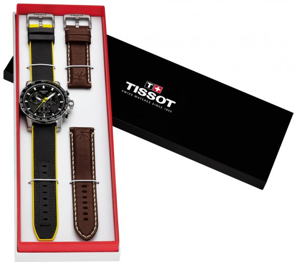 El reloj Tissot Supersport Tour de Francia 2020 se dirige a los fans incondicionales de esta carrera, cuyos momentos de gloria desatan pasiones en todos los rincones del planeta. La edición de 2020 de este cronógrafo de cuarzo de 45,5 mm de diámetro está fabricada en Suiza y luce los colores negro y amarillo oficiales del Tour. Su diseño ergonómico y aerodinámico se acentúa con unas agujas de gran tamaño que facilitan la lectura de la hora, incluso sobre la bicicleta. La marcada esfera negra se equilibra con tres contadores auxiliares que evocan las ruedas de las bicicletas de competición.
