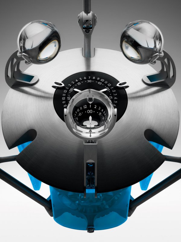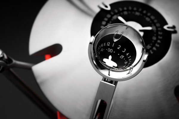 Una función esencial de TriPod es indicar la hora, que se puede ver mirando la esfera compuesta por discos giratorios. Sin embargo, este reloj requiere cierta interacción entre el hombre y la máquina: el observador lee la hora gracias a tres esferas ópticas. Cada una aumenta los números del reloj y los hace legibles. Para que los tres «ojos de insecto» den la hora desde cualquier ángulo, la esfera presenta tres grupos de números del 1 al 12, lo que significa que completa una vuelta en 36 horas en lugar de las 12 habituales. La hora es visible a través de cualquiera de las lupas en todo momento. «Estos relojes son nuestros compañeros, dice Büsser. Viven. Hacen tictac. Son como una mascota: dan vida a la casa». Jurassic Park también llevó vida allá donde no había