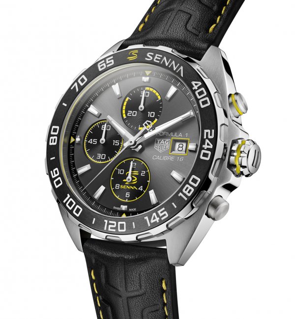 El robusto cronógrafo TAG Heuer Formula 1 Calibre 16 de 44 mm Senna Special Edition 2020 presenta una esfera antracita cepillada con efecto rayos de sol con contadores de minutos, horas y segundos permanentes en negro brillante «azurage». El revestimiento blanco de Super-LumiNova® en los índices y agujas aplicados chapados en rodio asegura una legibilidad de un vistazo a todas las velocidades y en todas las condiciones de iluminación. Este reloj lujoso pero deportivo se presenta con una correa de piel de becerro negra con forro negro y costuras en amarillo que combinan con los coloridos detalles en la esfera, alrededor de la ventana de fecha, alrededor del bisel y en el pulsador superior y la corona. Un guiño adicional a Senna es el patrón «S» en relieve en la correa, que recuerda a los eslabones de su brazalete de acero inoxidable TAG Heuer favorito. El cierre desplegable de acero inoxidable tiene un doble sistema de seguridad y una extensión piloto que permite llevar el reloj sobre un mono de conducción. El mecanismo de este reloj de edición especial es el Calibre 16 automático, que está protegido por un fondo de caja atornillado de acero inoxidable grabado con el logotipo de Senna.