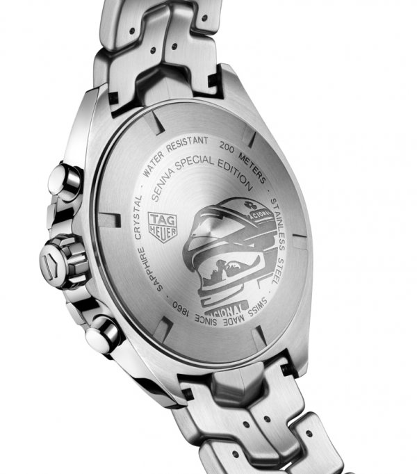 La caja y el fondo de caja atornillado con un grabado especial de Senna están hechos de acero inoxidable.