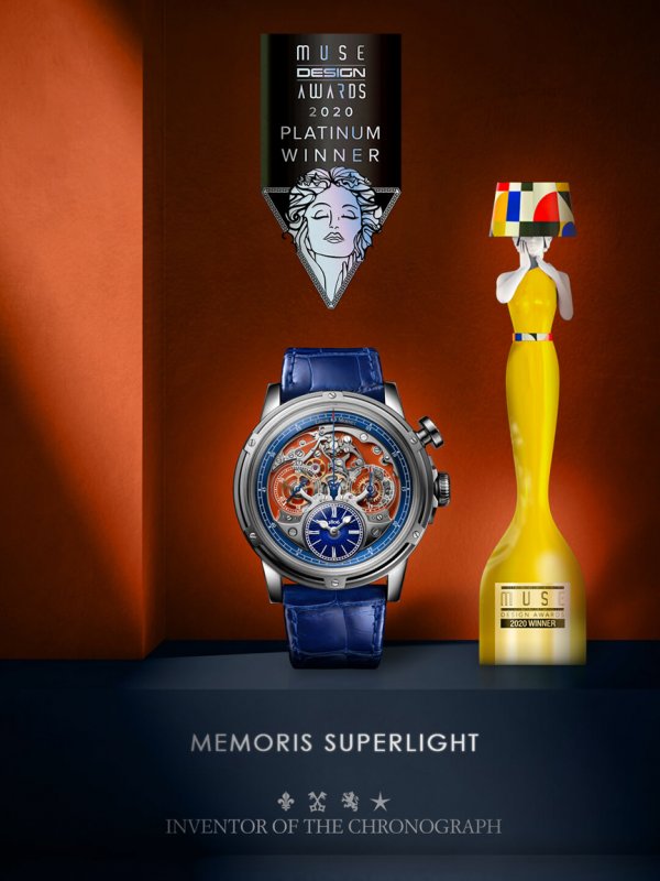 E l 2020 es un año rico en premios ganados por Memoris Superlight. Un «Platinum Award» otorgado por el Muse Design Awards se agrega a su lista de premios. Concurso internacional vanguardista, creado en 2018, Muse Design Awards honra a los profesionales del diseño y premia únicamente los conceptos de excepción, especialmente en el dominio arquitectural. Más de 4.500 candidatos, provenientes de 57 países diferentes, han sido registrados. El mecanismo de cronógrafo, enteramente visible a través del costado del cuadrante, ofrece a Memoris Superlight una estética fuera de lo común. Esta simetría entre construcción y diseño ha conquistado a los jurados y le ha permitido ser honrado con un nuevo premio.