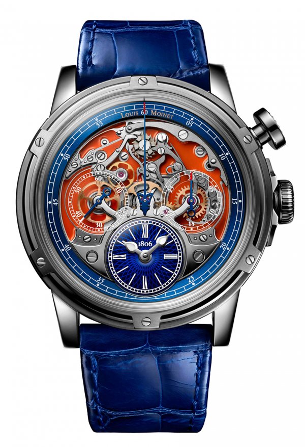 Louis Moinet inventó el cronógrafo en 1816, y en Les Ateliers Louis Moinet lo transformaron en el 2020. Todo comenzó con un diseño 100% ingenioso en el cual el mecanismo tradicional ha sido disasociado: el remontaje automático en el fondo y el sistema de cronógrafo en el frente. Esta nueva, única y destacada visión hace posible admirar el mecanismo de medición en cada interacción: salida, parada, reset. Más de 500 componentes han tenido que ser concebidos para alcanzar este incomparable hito. El diseño del Memoris es osado y contemporáneo. El naranja se intercala entre dos tintes de azul y responde al pulido de la caja en titanio de grado 5.