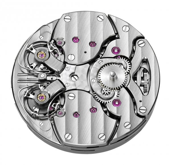 La esfera está provista de una subesfera con «guilloché» manual de Kari Voutilainen para la indicación de la hora: en esta subesfera desplazada del centro, los números romanos blancos son el elemento dominante e indican las horas y los minutos con agujas de acero, mientras una clásica minutería ferrocarril marca los minutos exactos. La otra subesfera más pequeña a las 7, muestra los segundos por medio de una aguja bastón y un camino clásico en la periferia. La esfera celeste con «guilloché» manual de Kari Voutilainen posee un acabado de laca especial (esmalte en frío) que refuerza el diseño exclusivo de la esfera. Los puentes lucen una decoración Côtes de Genève sobria y al mismo tiempo llamativa, aplicada por primera vez en forma de líneas rectas. El acabado absolutamente espectacular del movimiento suele pasarse por alto, porque la pulsación hipnótica de su muelle de embrague y el movimiento sincronizado de las dos ruedas de volante son tan fascinantes que acaparan toda la atención.