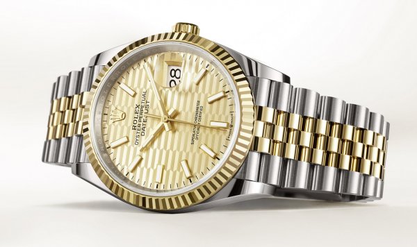 Las nuevas modalidades del Datejust 36 en acero Oystersteel –con esfera verde oliva y motivo «palmeras»– y en versión Rolesor amarillo (combinación de acero Oystersteel y oro amarillo de 18 quilates) –con esfera dorada y motivo «palmeras»– están dotadas de un brazalete Oyster. Desarrollado a finales de la década de 1930, este brazalete de tres elementos destaca por su robustez. Fabricada en versión Rolesor Everose (combinación de acero Oystersteel y oro Everose de 18 quilates), la nueva modalidad con esfera plateada y motivo «palmeras» está equipada con un brazalete Jubilee, al igual que la modalidad en versión Rolesor amarillo con esfera dorada y motivo «acanalado». Fluido y confortable, el brazalete Jubilee de cinco elementos se creó específicamente para el lanzamiento del Oyster Perpetual Datejust en 1945.