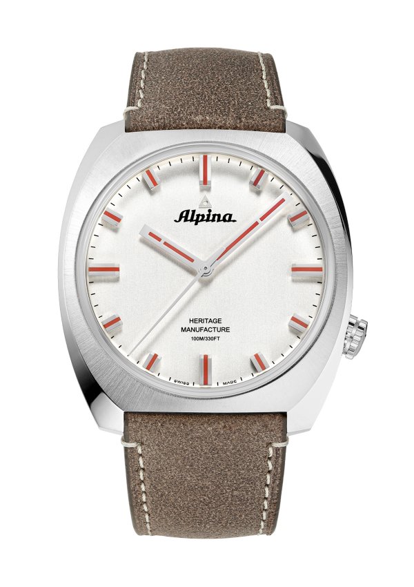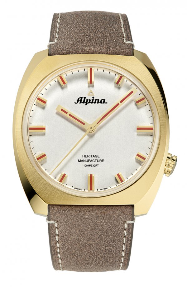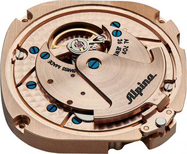 El calibre AL-709 se ciñe al contorno, como signo de respeto por las tradiciones relojeras. Según la antigua usanza, el calibre y la caja deben adoptar exactamente el mismo perfil (tradición de los llamados movimientos de «forma»). Fondo y forma se fusionan. El corazón palpitante del reloj se fusiona con el delicado cojín que abraza el contorno de la muñeca. Finalmente, para perfeccionar su estética vintage, Alpina ha dotado al Startimer Pilot Heritage Manufacture de una esfera cuyo diseño icónico hace referencia también a los relojes de piloto creados por la Maison en la década de 1950.