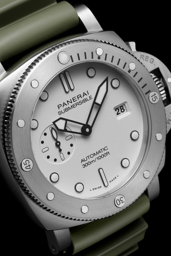 Con el debut del Panerai Submersible QuarantaQuattro, la caja de 44 mm se convertirá en el pilar de la icónica colección de relojes de buceo Submersible, uniéndose a los tamaños existentes de 47 mm y 42 mm. La opción adicional asegura que hay un Submersible para satisfacer una amplia gama de usuarios sin importar el tamaño de reloj que prefieran. Todas las características esenciales que son el sello distintivo de la familia Submersible existen en el Sumergible QuarantaQuattro: es resistente al agua hasta 300 metros, con el dispositivo de protección de la corona patentado que está indisolublemente ligado a la historia de Panerai de aventura marina. Además, un bisel giratorio unidireccional para medir el tiempo de inmersión y apliques metálicos rellenos de Super-LumiNova™ blanca hacen del reloj un instrumento de buceo indispensable. El calibre P.900 cuenta con un subesfera de segundos a las 9 en punto y proporciona una reserva de marcha de tres días. Una esfera blanca brillante con correa en un tono verde militar supremamente versátil distingue al Submersible QuarantaQuattro Bianco (PAM01226). Todos los relojes se caracterizan por el compromiso constante de Panerai de fomentar prácticas respetuosas con el medio ambiente.