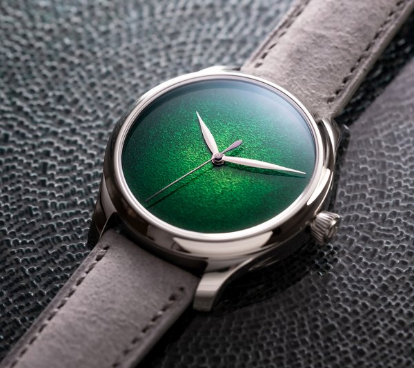 H. Moser & Cie revisita las esferas fumé para rendir homenaje al arte del esmaltado, dotando de una sensibilidad moderna a esta técnica ancestral. Esto ha resultado en una nueva e intensa combinación de colores, con un brillo muy actual y una original textura. El Endeavour Centre Seconds Concept Lime Green, combina la elegancia clásica de un reloj de tres agujas con una estética perfectamente equilibrada y un impresionante carisma. En el corazón de la caja de acero de 40 mm late el calibre automático HMC 200. Este movimiento, de diseño, desarrollo y producción internos, está equipado con un órgano de regulación fabricado por Precision Engineering AG, empresa hermana de H. Moser & Cie., e incorpora una espiral doble, identificable al instante gracias a su segundero morado y al puente de volante azul. Decorado con las célebres rayas dobles de Moser, el calibre HMC 200 presenta una masa oscilante grabada de gran tamaño y garantiza una reserva de marcha mínima de 3 días. Su correa de piel de kudú gris aporta un elegante toque final a este atrevido cóctel: moderno, poco convencional y con una sensibilidad decididamente contemporánea.