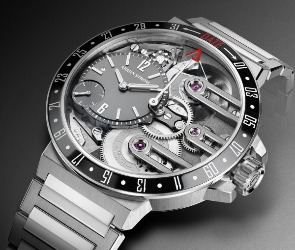 Armin Strom presenta «Orbit» en su primera edición, limitada a 25 piezas: un modelo de diseño deportivo con la función de fecha indicada en el bisel, controlada por una rueda de pilares, que puede activarse y desactivarse con tan sólo pulsar un botón. Este sistema, muy frecuente en los mecanismos de cronógrafo, mejora la estabilidad y el funcionamiento del indicador de fecha. La fecha se indica en el bisel por medio de una aguja central de gran tamaño con una «A» roja en la punta, en alusión a Armin. Los días del mes –del 1 al 31– están grabados en blanco sobre la circunferencia del bisel de cerámica negra pulida, creando un fuerte contraste que permite su lectura instantánea. La aguja de la fecha posee dos modos: uno estacionario y otro activo. Cuando se encuentra en modo estacionario, está, en principio, en «off» o desactivada, y permanece en posición fija apuntando hacia las 12, dejando ver sin obstáculos la esfera desplazada del centro. Con el pulsador situado en el lado izquierdo de la esfera, la aguja de la fecha se halla «activada» y salta para indicar la fecha correcta. En este modo, la fecha avanza automáticamente una vez al día, a medianoche. Si se pulsa de nuevo el botón, la aguja regresa a su posición estacionaria, con una memoria mecánica que le permite saltar hacia atrás hasta la fecha correcta cada vez que lo desea el usuario. Gracias al mecanismo retrógrado, la aguja de la fecha salta hacia atrás desde el 31 al 1, evitando cualquier confusión con la posición de la aguja, si esta se encuentra en el modo estacionario. La fecha se puede ajustar rápidamente con ayuda del botón corrector situado en la posición de las 8 horas de la caja, o se puede hacer avanzar manualmente con la corona al adelantar la hora.