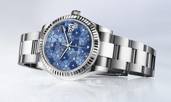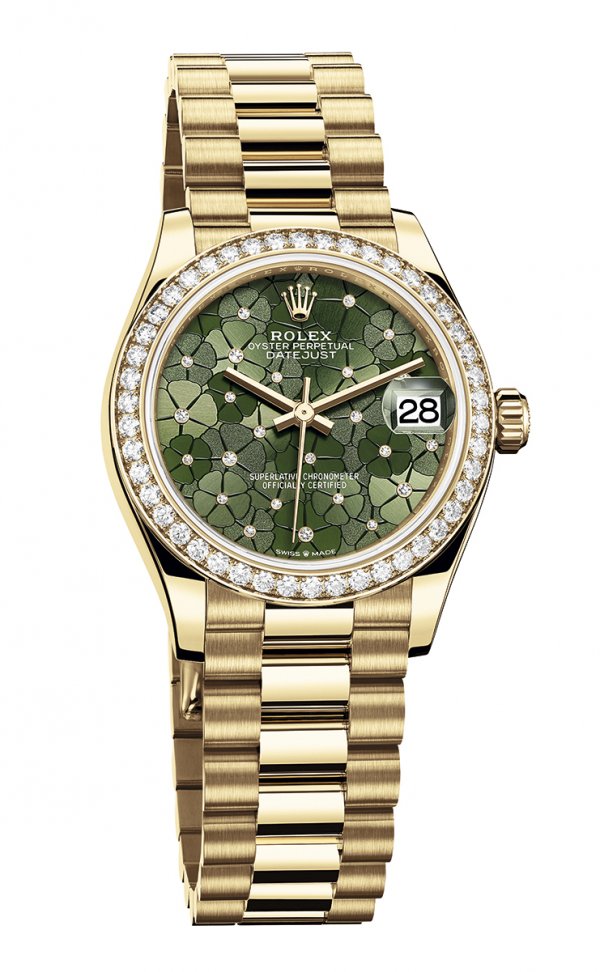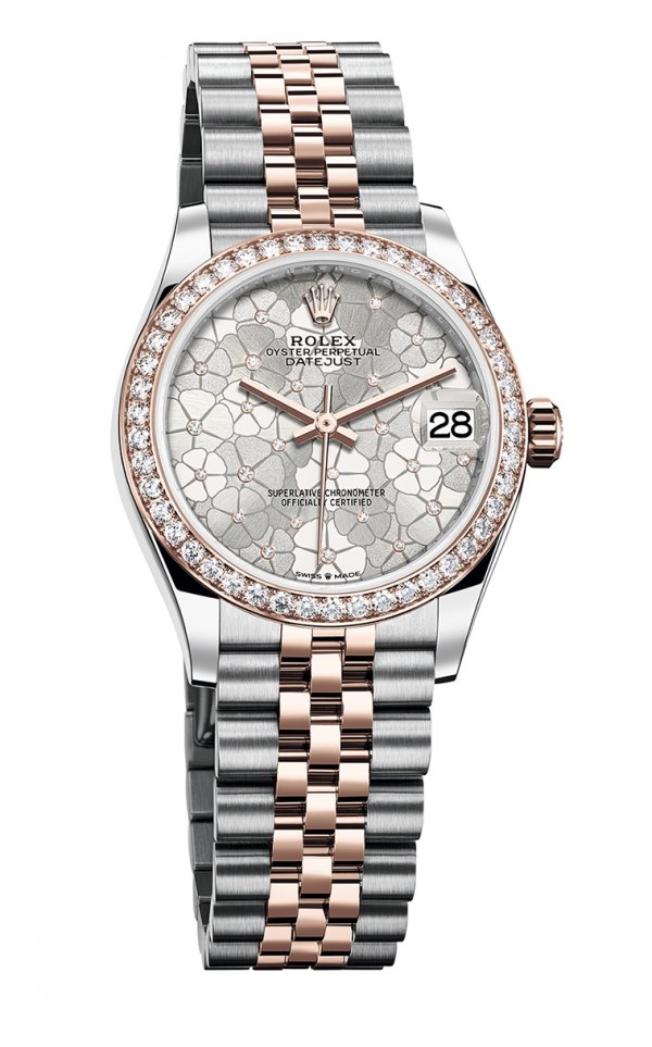 L as esferas de los nuevos Datejust 31 son un concentrado de energía primaveral, un colorido soplo, un destello poético, una sensación de renacimiento. Las tres nuevas modalidades se caracterizan por su motivo floral. Este diseño inédito, que evoca las praderas salvajes, representa 24 flores que se distinguen entre sí por su acabado: tipo sol, mate o granulado. Cada una de ellas está iluminada por un diamante, una nota brillante engastada en el centro de las corolas. La esfera con motivo floral es azul azzurro en la primera modalidad, realizada en Rolesor blanco (combinación de acero Oystersteel y oro blanco) y coronada con un bisel estriado. La del segundo reloj –fabricado en oro amarillo de 18 quilates– es verde oliva, y plateada la del último, en versión Rolesor Everose (combinación de acero Oystersteel y oro Everose). Ambos relojes están dotados de un bisel engastado de 46 diamantes talla brillante. En la versión Rolesor blanco, el bisel es de oro blanco, mientras que la corona, la carrura, el brazalete y el cierre son de acero Oystersteel. En la versión Rolesor Everose, el bisel, la corona y los elementos centrales del brazalete son de oro Everose, mientras que la carrura y los elementos laterales del brazalete son de acero Oystersteel.