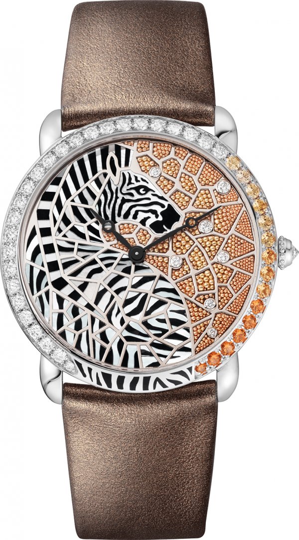 Los artesanos de Cartier se han inspirado en el bestiario de Cartier, más concretamente en los grandes animales de África: la pantera, felino emblemático de la Maison desde 1914, la jirafa y la cebra. Animales poderosos y majestuosos que prestan el temperamento de su perfil a los artesanos esmaltadores y joyeros. Tres relojes que conjugan el savoir-faire de los oficios artísticos de Cartier y el doble enfoque de la fauna propia de Cartier: uno figurativo, otro abstracto.