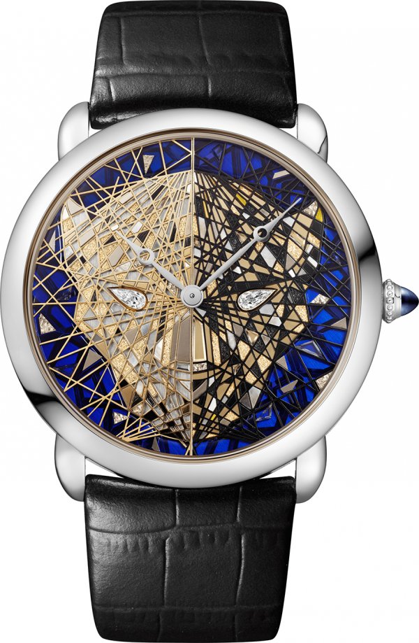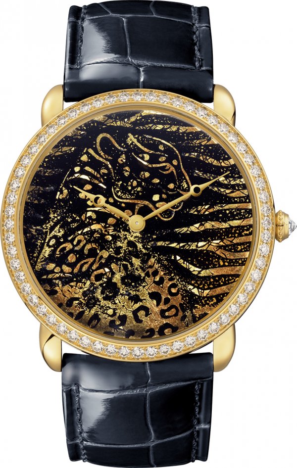 Emerge vívidamente en trazos de fuego y llamas sobre un fondo negro. La pantera, la musa eterna de Cartier, cuyos artesanos de la Maison des Métiers d’Art exploran sin descanso su potencial creativo. El perfil del animal está elaborado sobre una lámina de oro de apenas unas micras de grosor. A continuación, éste se coloca entre múltiples capas de esmalte negro y translúcido, que vitrifican al cocer. Toques de esmalte rosa translúcido dan calidez y armonía al motivo. El fondo negro intensifica el diseño a través del contraste. Mediante polvo de oro se realizan ínfimas modulaciones de los colores y las formas. La creación de esta esfera requiere entre doce y quince pases en el horno a una temperatura de unos 800º C, dependiendo de la reacción de los esmaltes. Cada pase en el horno supone un gran riesgo para la pieza completa. Más de 46 horas de trabajo han sido necesarias para esmaltar este reloj, disponible en una edición numerada y limitada de 30 piezas.