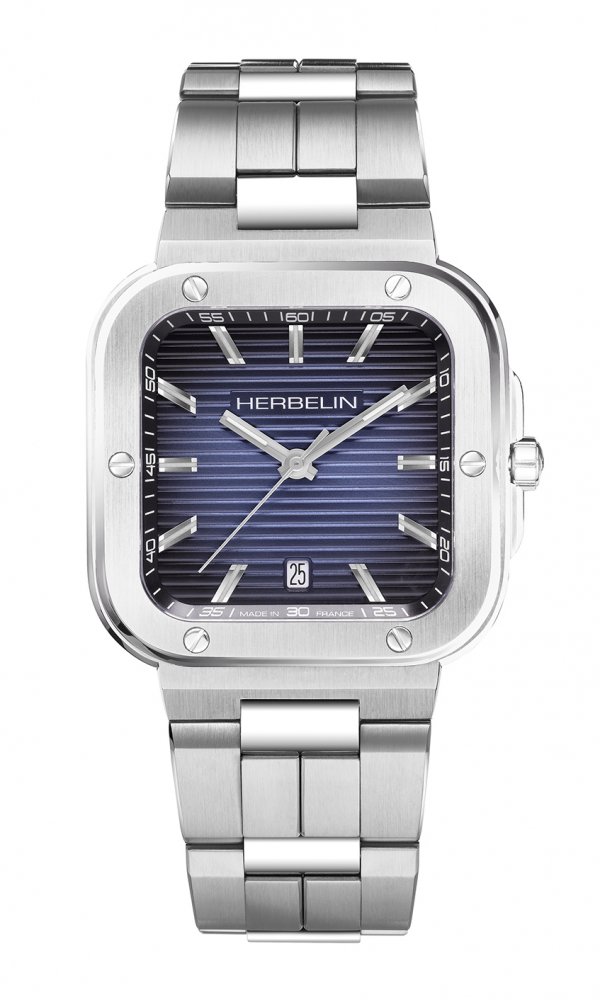 L anzado en 2018 por la empresa relojera francesa Herbelin, la colección Cap Camarat le da la bienvenida a un nuevo modelo para hombre con una distinctiva forma cuadrada. Con un gusto por la modernidad pero conservando un espíritu neo-vintage, este reloj urbano presenta una estética casual-chic bajo cualquier circunstancia. Revisitando una pieza del patriminio relojero de Herbelin de los años 1970, este modelo Cap Camarat enfatiza su carácter vintage con su caja de 39 mm x 39 mm. Hecha de acero inoxidable, su forma cuadrada con esquinas redondeadas se complementa con un acabado cepillado vertical resaltado con facetas pulidas. Afirmando una robustez geométrica, reforzada por la protección de la corona, atrae la atención hacia el bisel cuyos seis tornillos decorativos están sutilmente posicionados en una extensión de los marcadores de hora.